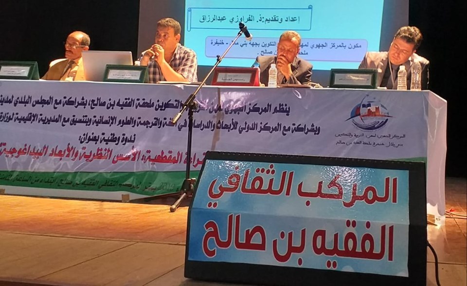 نظم المركز الجهوي لمهن التربية والتكوين ملحقة الفقيه بن صالح بشراكة مع المجلس البلدي بالمدينة ومع المركز الدولي للأبحاث والدراسات في اللغة والترجمة والعلوم الإنسانية، وبتنسيق مع المديرية الإقليمية لوزارة التربية الوطنية الفقيه بن صالح ندوة وطنية في موضوع: “القراءة المقطعية أسسها النظرية وأبعادها البيداغوجية” وذلك يوم السبت 15 يونيو 2019 .